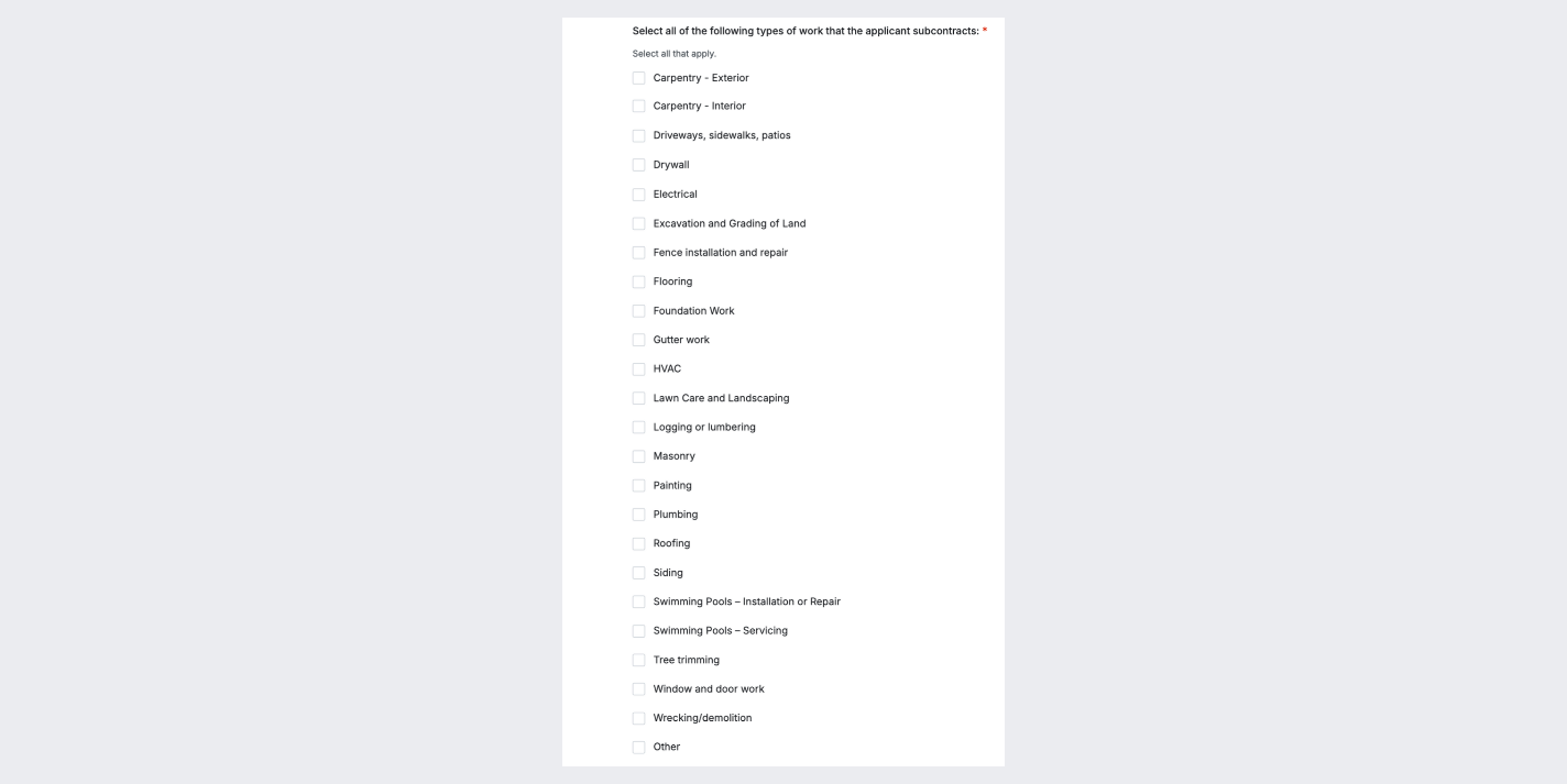 Note, if you pick the Remodeling Contractor code, it already includes many jobs like installing appliances, doing carpentry, putting up drywall, electrical work, and more. You don’t have to pick each of these separately. However, for big jobs like roofing and plumbing, you might still need to add those separately.