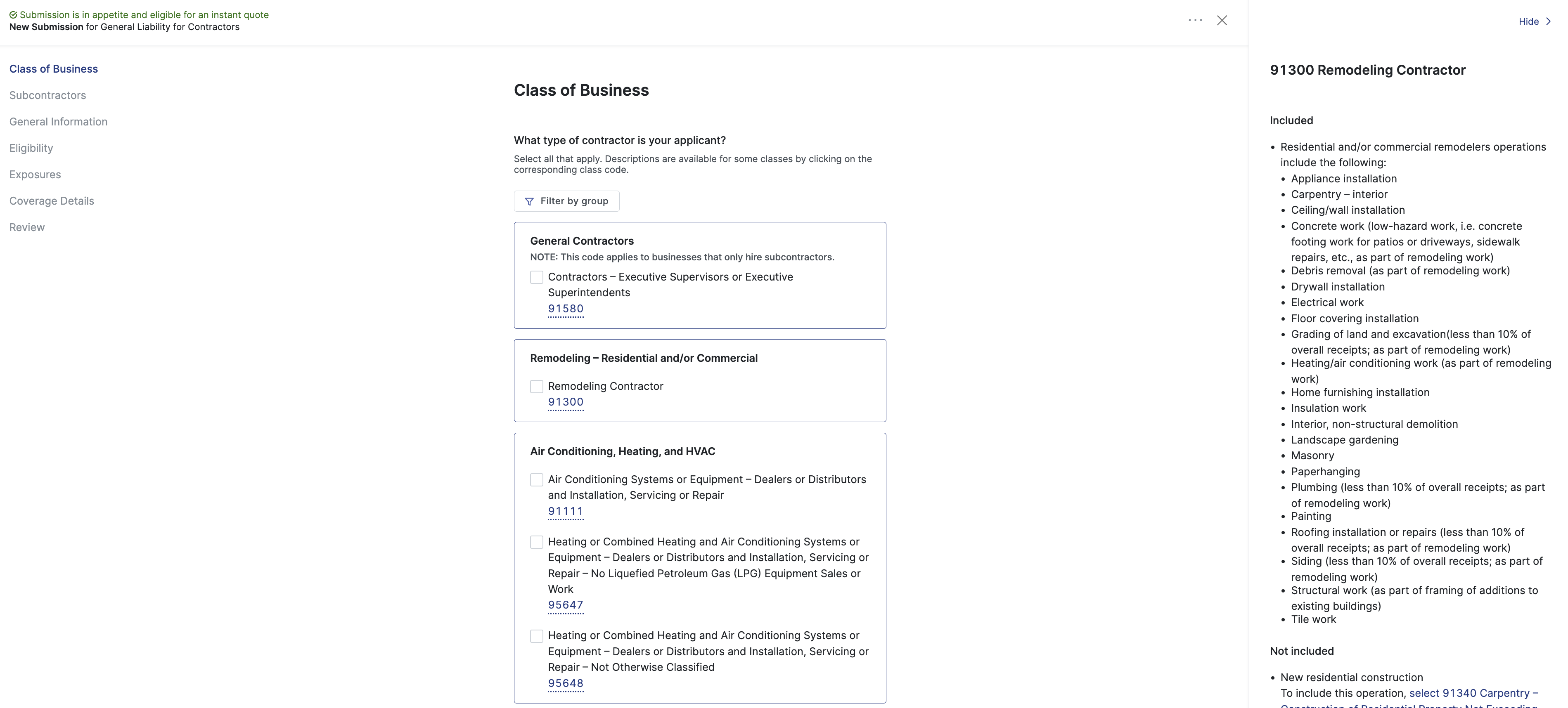 There isn't a specific limit to the number of class codes that can be quoted for contractors, as we typically provide instant quotes for contractors with three to four operations.
