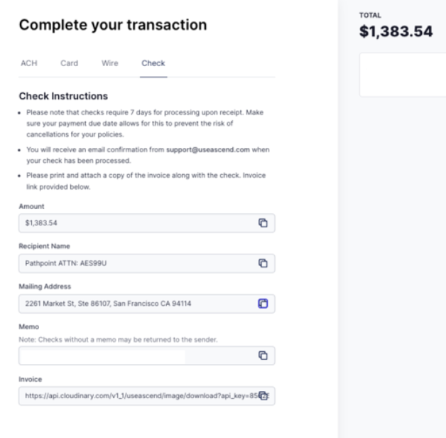 Due to timing issues for binding, PathPay Insured users cannot submit payment by check.
