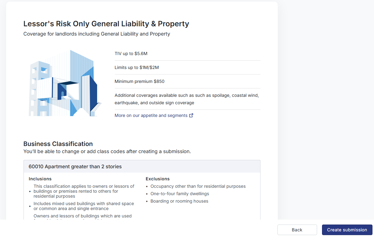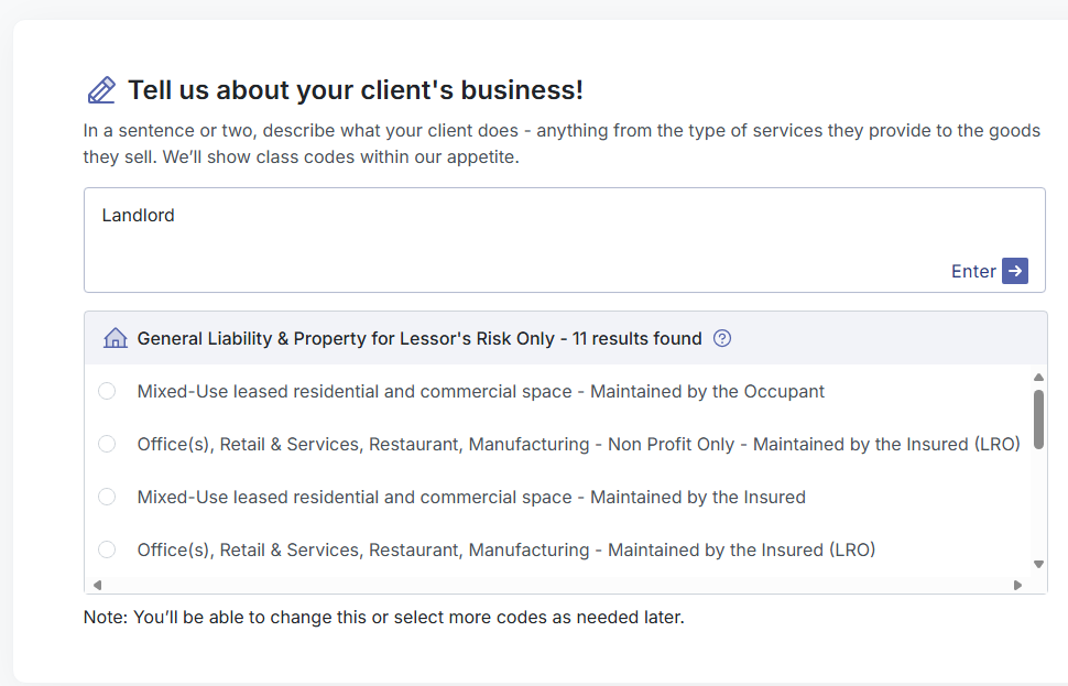 Enter your client's business operations and/or occupancy to save time upfront, pre-populating the application.