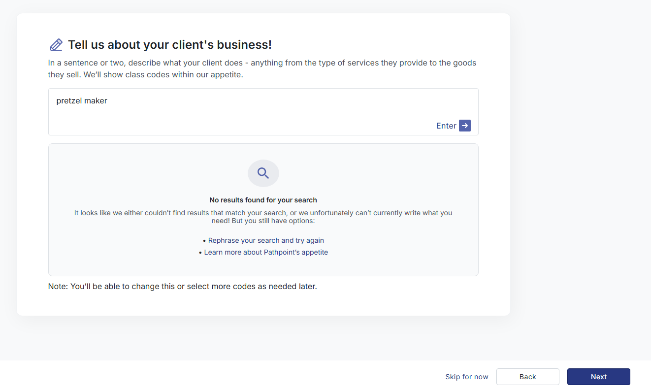 Select a class description and hit Next. If you don't see the appropriate class description appear, you can click Skip for now at the bottom right-hand corner to proceed to selecting a class of business later.