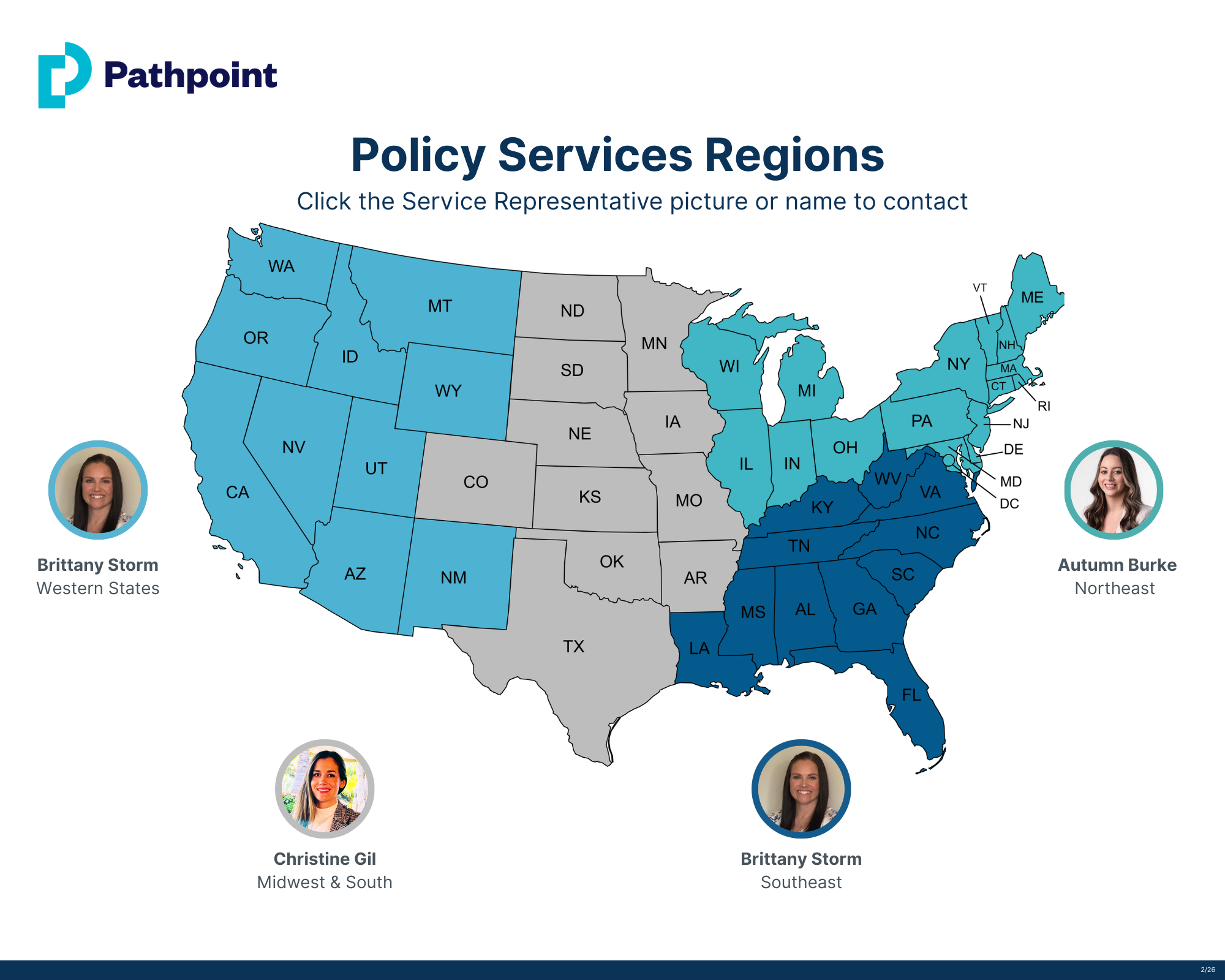 Each region has a dedicated service representative to assist with policy needs related to audits, inspections, endorsements, claims, loss runs, taxes and fees, renewals, and cancellations.