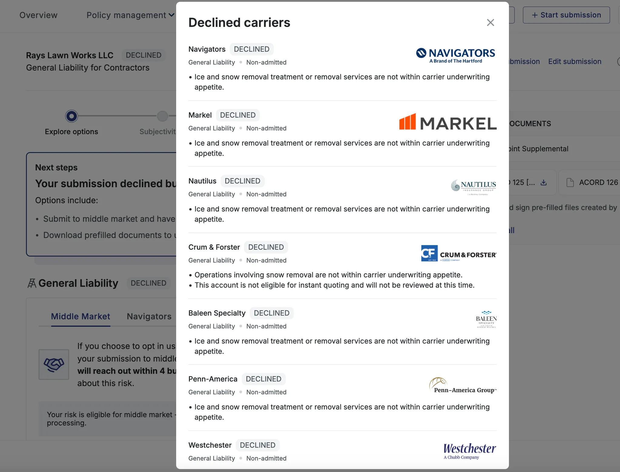 When you click the link in the email, a pop-up window will appear, displaying the reason for the declination given by the carrier.