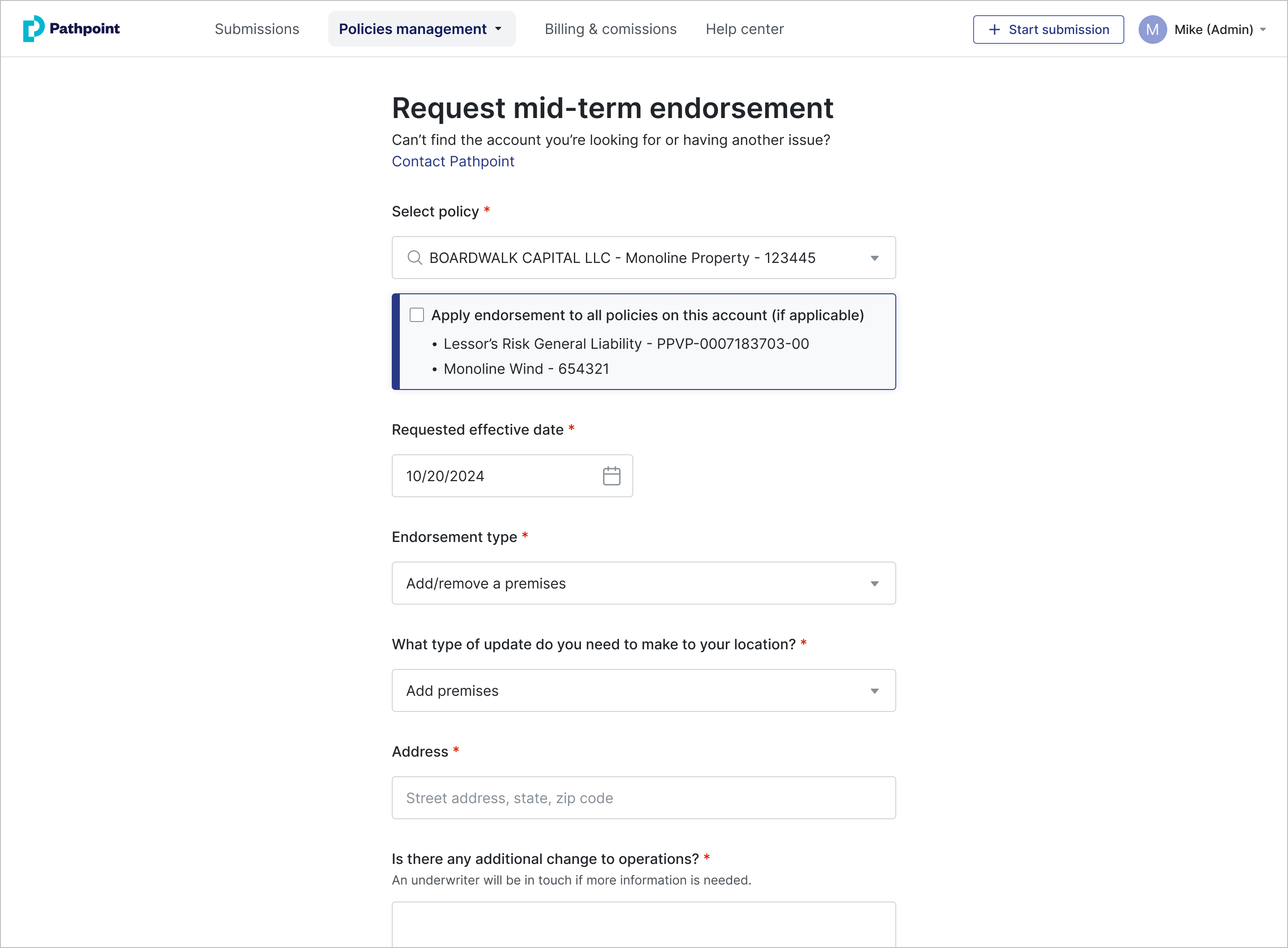 Select, Request Mid-Term Endorsement. For packages created with Mix and Match, you can click the checkbox to request endorsements to both policies at once. Enter the changes you wish to make and hit Submit.