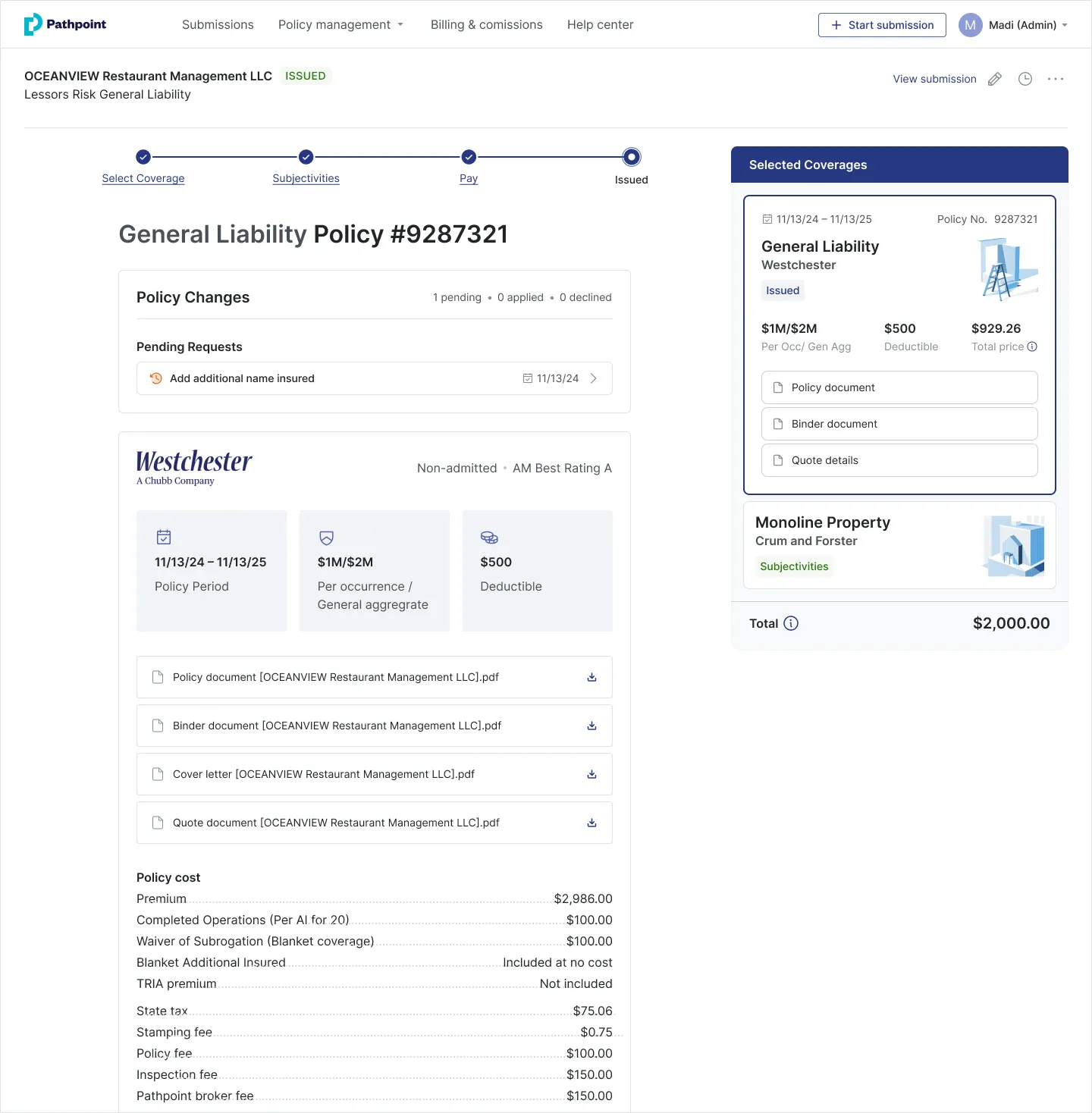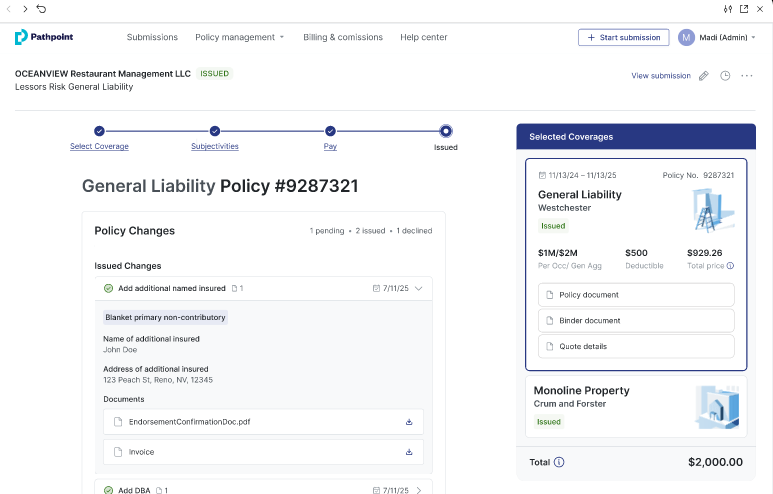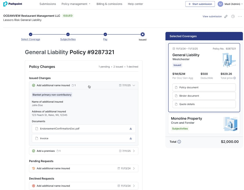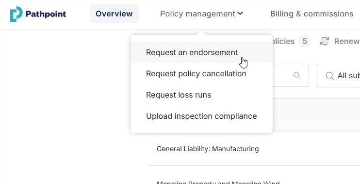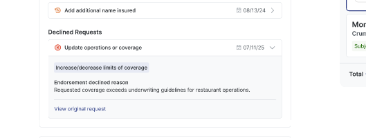 Agents can now request endorsements and view policy updates directly on the Policy Details page. Mid-term changes are clearly shown, so agents always have the most accurate account information.