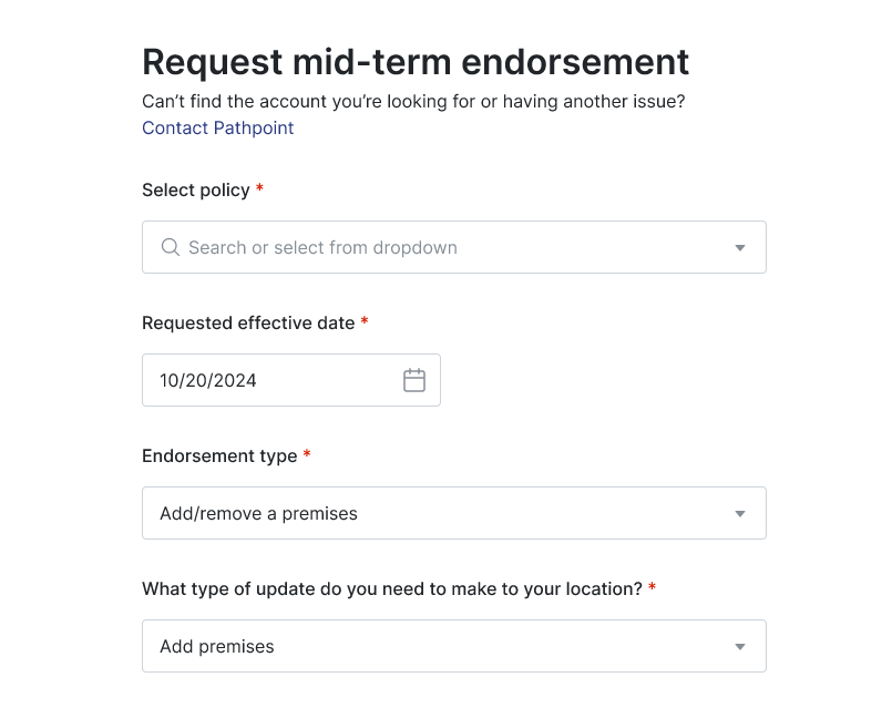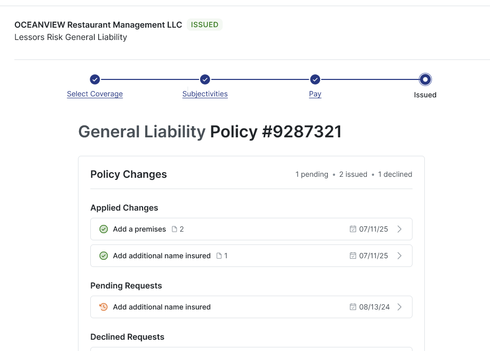 Endorsements: Request changes to a bound policy, such as updating additional insureds, mailing or premises addresses, contacts, operations, or coverage. Learn more about requesting endorsements.
