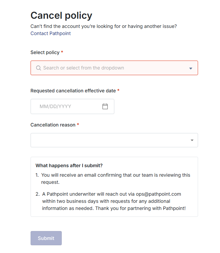 Once a policy is bound, you can manage service requests directly in Pathpoint. Easily request endorsements, cancellations, reinstatements, and loss runs, as well as upload compliance documents — all from the Policy Management tab. After a request is submitted, you can expect to hear from your service representative within two business days.