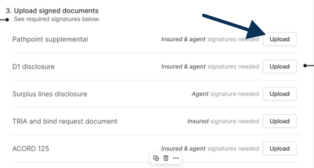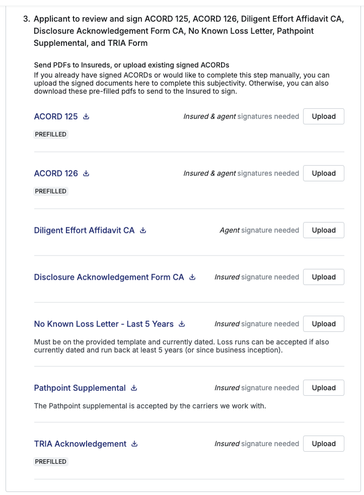 At Pathpoint, we streamline the process of completing supplements and subjectivities with our comprehensive e-signable binding experience. We offer a complete downloadable packet that includes all essential forms, such as our supplementals, TRIA, the No-Known Loss letter, and more, to facilitate a quicker and compliant E&S binding process. Agents have the option to use e-signing online or to download and sign the forms manually.
