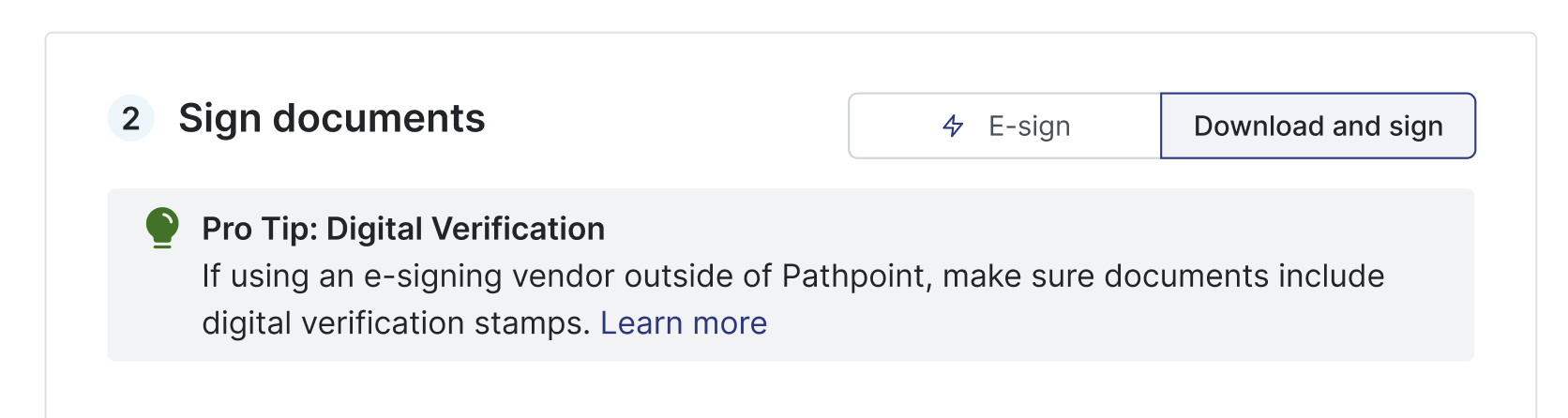 The Pro-Tip Tool will appear. Any e-signature requires a digital verification stamp. Click Learn more to verify acceptable digital verification stamps.