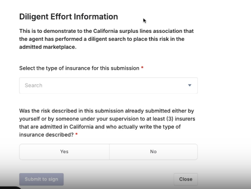 Complete the Diligent Effort Information. This typically requires insurance agents to list their three attempts to quote within the admitted market; however, this can vary by state (make sure to check with your state's guidelines)