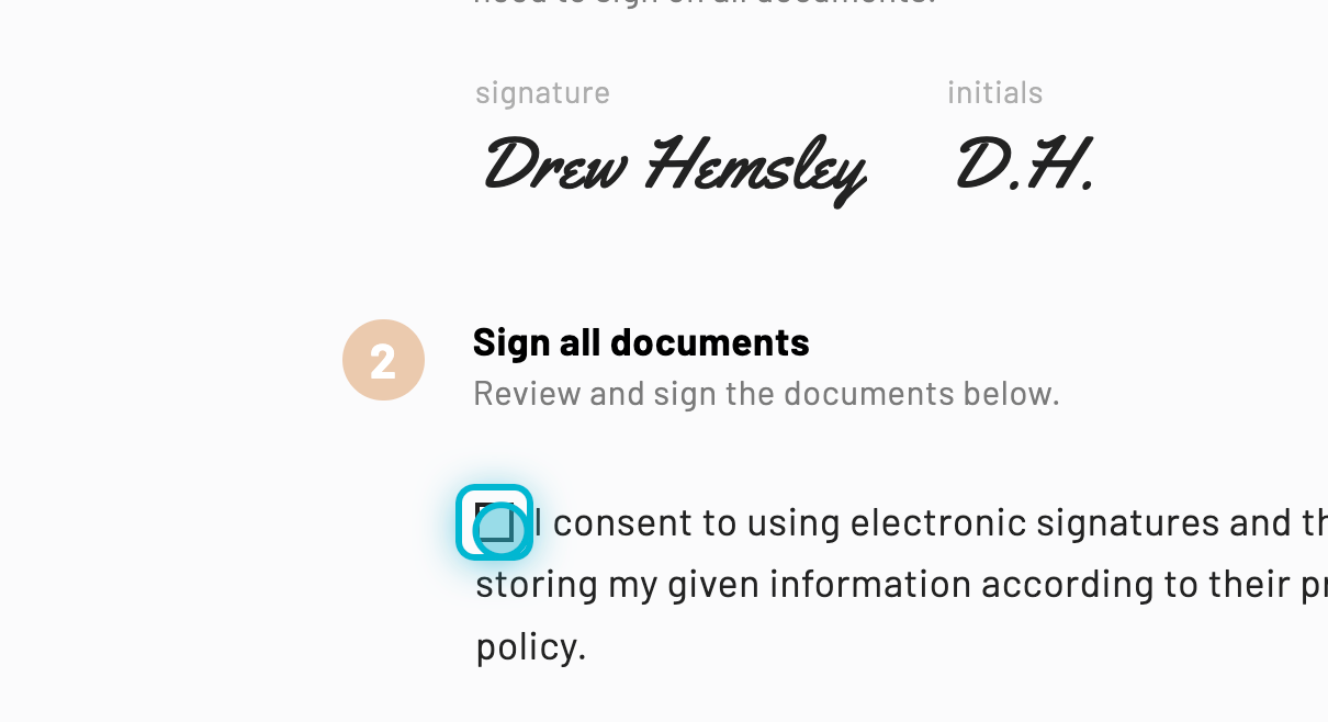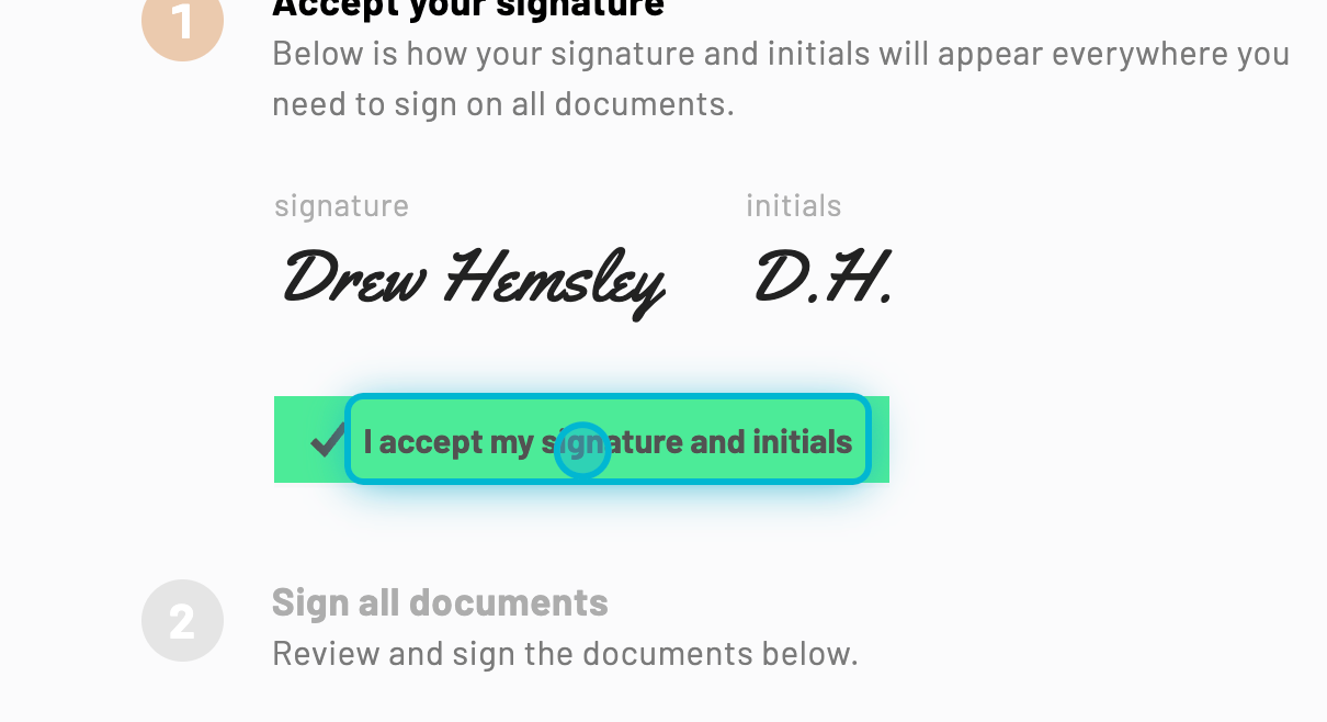 The documentation will be pre-filled with the information you entered in the previous step. Click "I accept my signature and initials".