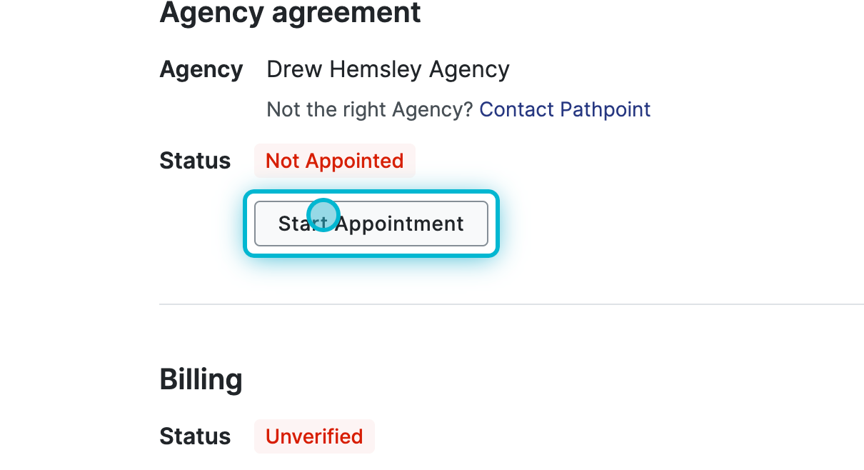 Head back to Pathpoint and refresh your profile page where you initially started the appointment process. Status under "Agency Agreement" should now say "Appointed".