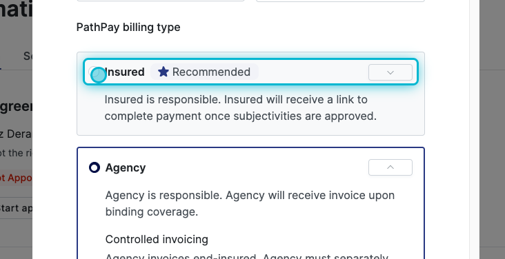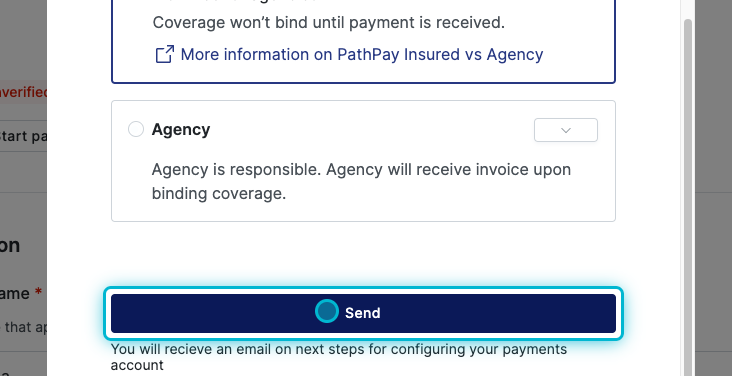 Choose PathPay Insured or Agency (insured means the agent will pay Pathpoint directly and agency means your agency will pay Pathpoint on the agent's behalf), and click Send.