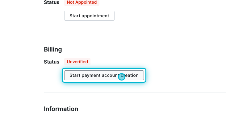 Click Start payment account creation in the Billing section.