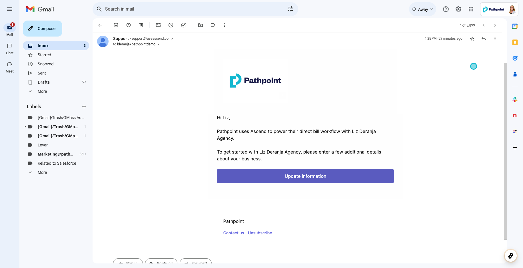 Open the email inbox of the email address you just entered into the billing information when you set up your PathPay account in Pathpoint. You should find an email coming from "support@useascend.com" that looks like this. Click Update Information in the email body.