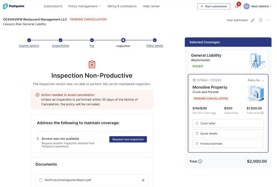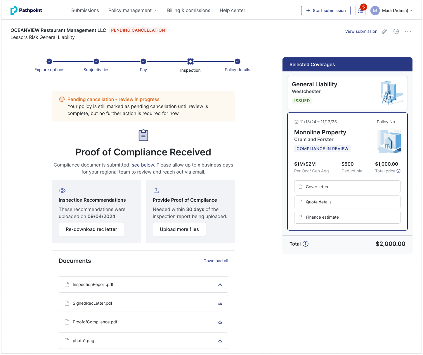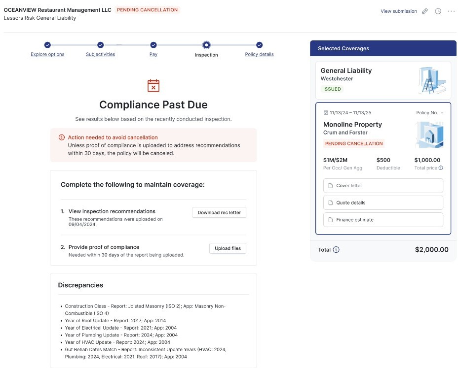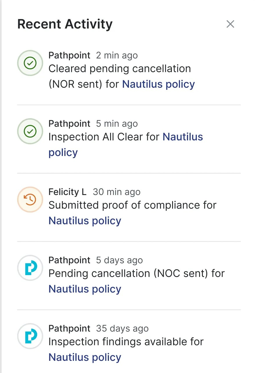 Once you complete the action item—inspection request, compliance upload, or payment—our Operations team issues a Notice of Rescission (NOR). The policy status reverts to Issued, and you’ll see this update in Recent Activity.
