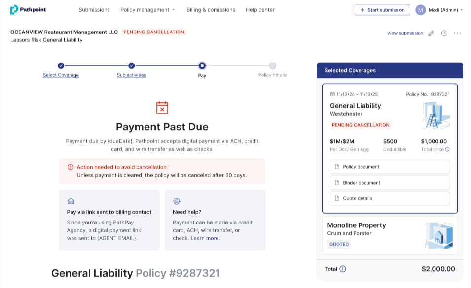 Agents will see a Pending Cancellation status in-app for non-insured-requested cancellations. Upon clicking the status, you will be taken directly to the action item to remedy the issue and prevent cancellation. Below are the most common reasons for cancellation and what to expect for resolving them: