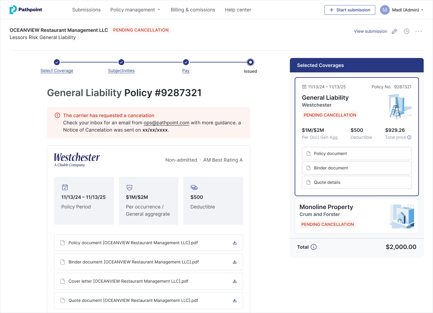 When a Notice of Cancellation (NOC) is issued, the policy status changes to Pending Cancellation in red. An action item appears on your dashboard.