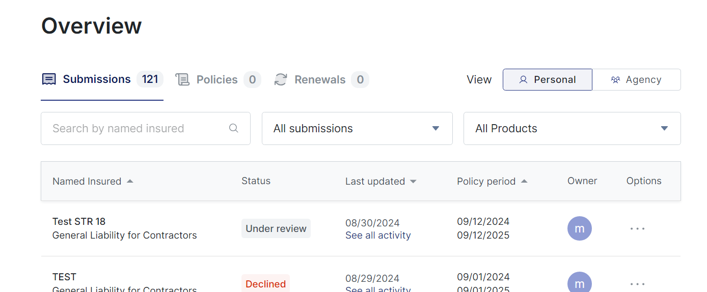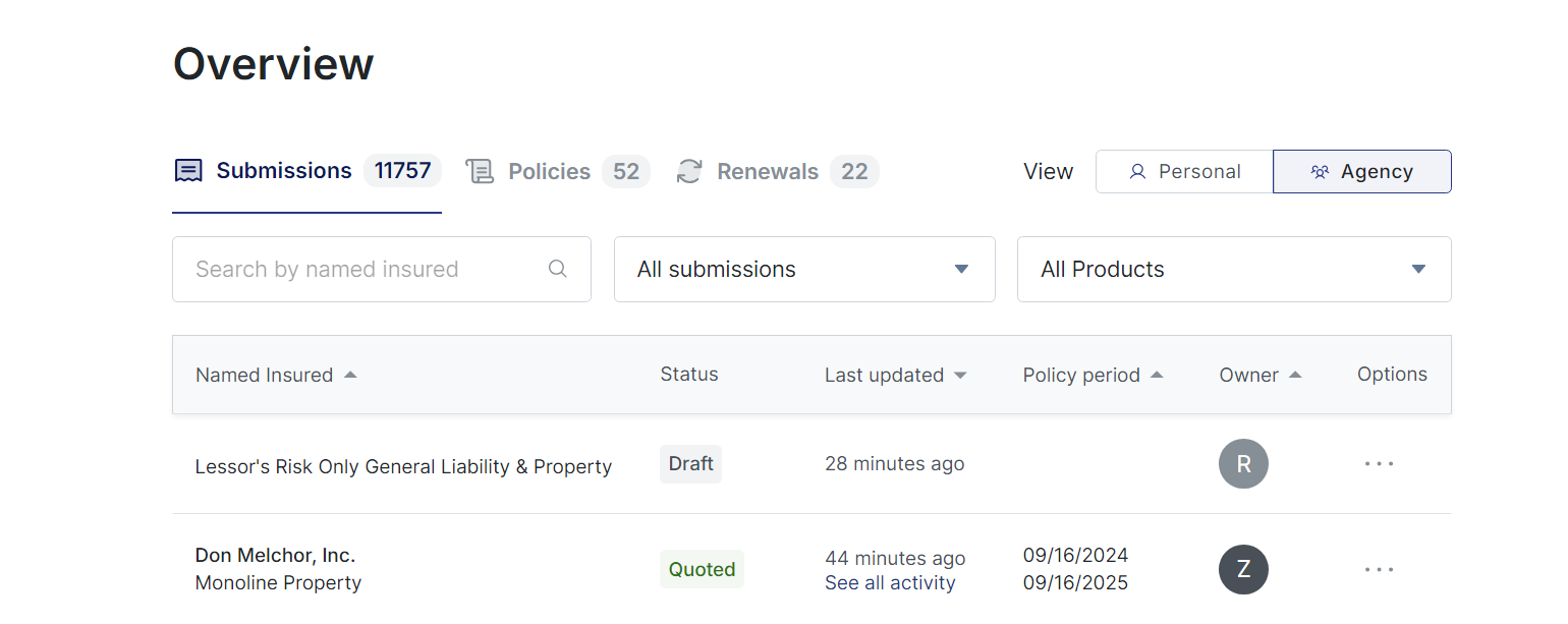 There will be two heading tabs: Your Submissions and All Agency Submissions. Users within an agency can filter between their individual accounts and the accounts within the agency.