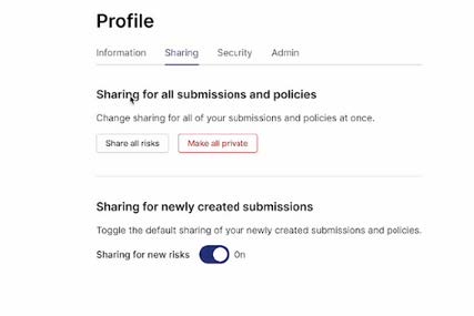 Under the Profile section, you have the option to Share all risks or Make all private. Additionally, you can turn the sharing toggle off for new risks.