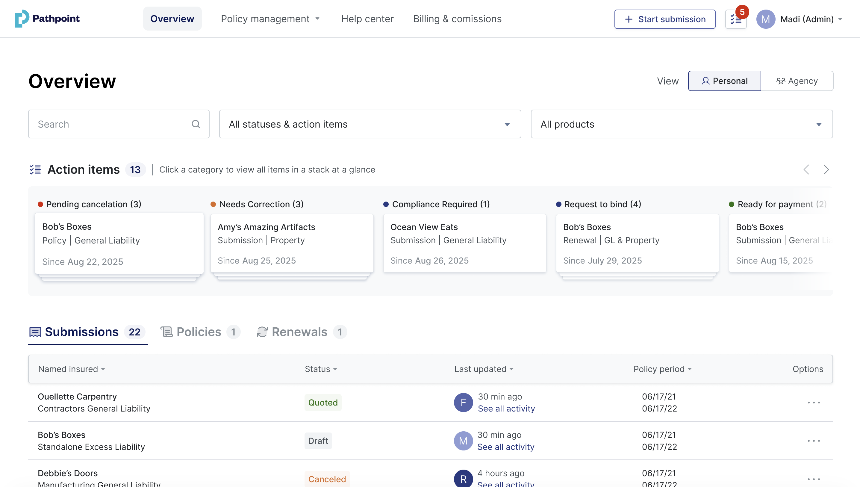Pathpoint Action Items help you stay on top of what needs to get done to move submissions forward and keep policies active. Whether you're an individual agent or part of a larger team using shared inboxes or servicing high-volume accounts, you can now view all open Action Items across your agency using the Agency-Level Action Items toggle.